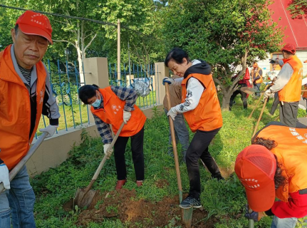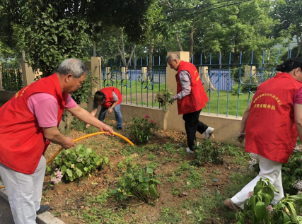 由于棲化新村社區(qū)東門停車場施工建設(shè),社區(qū)老黨員志愿者們拿著移栽工具將區(qū)域及周邊繡球花卉移植到社區(qū)新時代文明實踐站內(nèi)。
