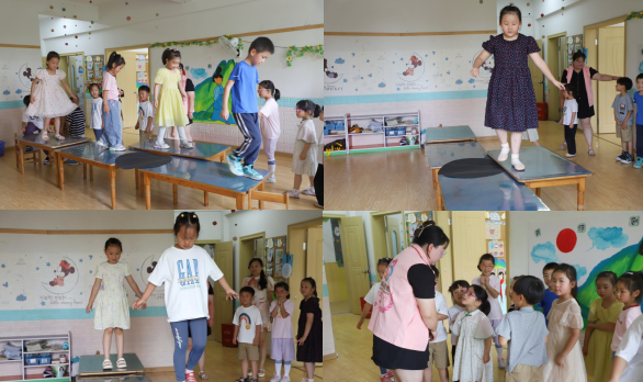 最后,老師將桌子擺成一條,當(dāng)作馬路,然后把卡紙做的模擬井蓋,放在兩個桌子中間。讓孩子們逐一上前演練“如何避免踩空井蓋”,孩子們學(xué)得不亦樂乎,互相交流感受,現(xiàn)場充滿了歡快的氣氛。