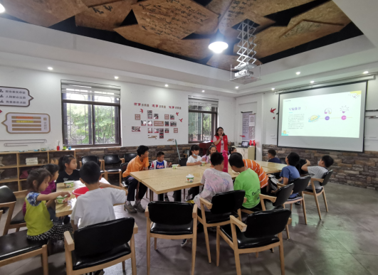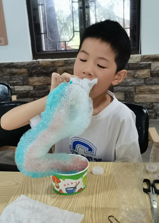 活動中,志愿者老師通過分享實驗視頻引導(dǎo)同學(xué)們操作,通過開展“彩色泡泡龍”的實驗探究,使得同學(xué)們能夠利用生活用品制作有趣的小實驗,并且在這樣一個輕松、快樂的環(huán)境下認識到泡泡的產(chǎn)生是水的表面張力在洗潔精這一表面活性劑的作用下形成的。
