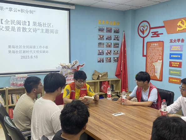 2023年6月18日,南京市棲霞區(qū)馬群街道果場社區(qū)全民閱讀小組聯(lián)合社區(qū)教育中心,組織社區(qū)“齊益果”積分制志愿者、鐘山學(xué)院學(xué)生、社區(qū)青少年在社區(qū)一樓活動室開展了本月全民閱讀交流會。本次全民閱讀活動旨在父親節(jié)來臨之際,通過文字書籍的力量,讓青少年感受到父愛的“潤物細(xì)無聲”,促進(jìn)家庭和諧。