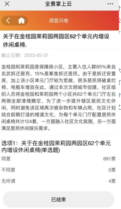 近日,金陵驛社區(qū)通過“掌上云”平臺投票系統(tǒng)針對增設(shè)休閑桌椅事項征求轄區(qū)居民意見,此項舉動在“掌上云”小程序里得到了居民的大力支持。“線上議事真的是太方便我們居民了,以前張貼告示有什么意見還需要再去社區(qū),現(xiàn)在手機上就能操作了。”老黨員田師傅激動地說。
