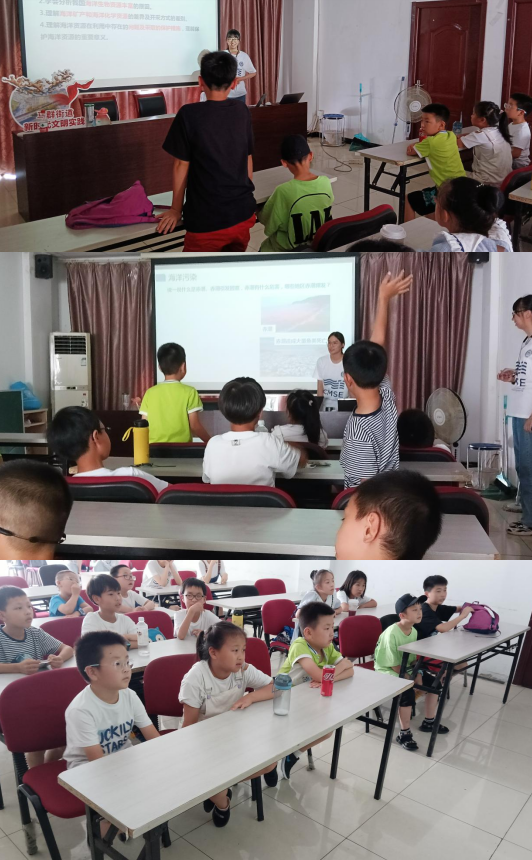 陳姝宇同學(xué)向小朋友們科普了海洋資源的種類與開發(fā)利用現(xiàn)狀。李燕芳同學(xué)則對海洋資源遭受到的污染危機(jī)與挑戰(zhàn)展開介紹。在科普的過程中陳姝宇同學(xué)先后就著海洋資源的種類與重要性、四大中國海進(jìn)行介紹,并與小朋友們展開互動。許多小朋友們針對保護(hù)海洋資源的話題發(fā)表看法并與志愿者老師進(jìn)行交流,碰撞思維火花,在知識競答的過程中不斷加深對海洋資源的認(rèn)識。李燕芳同學(xué)則對海洋資源保護(hù)面臨的危機(jī)與挑戰(zhàn)展開詳細(xì)地介紹,并號召小朋友們愛護(hù)海洋資源并合理利用海洋資源,并獲得小朋友們的一致好評。張爍同學(xué)對小朋友展開暑期安全教育,讓小朋友們在享受暑期愉悅的同時保護(hù)自己。