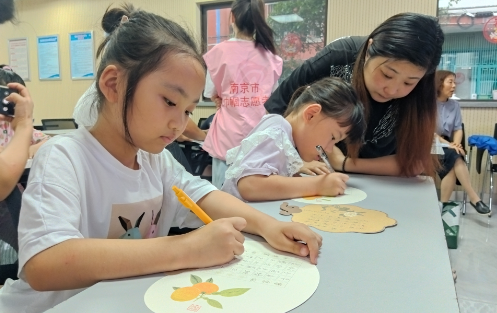 活動(dòng)開始,小朋友們先在紙扇上寫下自己喜歡的關(guān)于夏天的詩,有的小朋友寫《小池》,有的小朋友寫《曉出凈慈寺送林子方》,有的小朋友寫《池上》,都是些膾炙人口的小詩,也是小學(xué)的必讀古詩,孩子們一筆一劃寫的都很認(rèn)真,有兩個(gè)小朋友字寫得特別工整漂亮,一了解原來都是培訓(xùn)班學(xué)習(xí)過的。