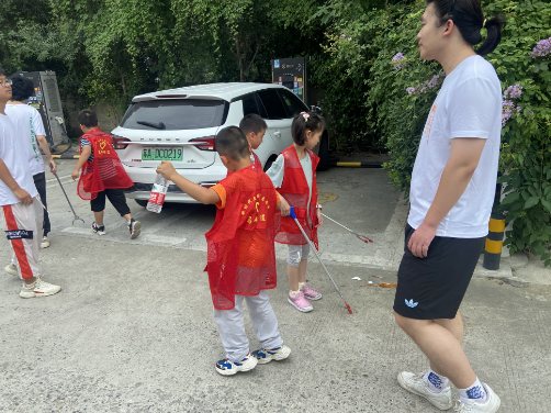 在社區(qū)陶家營路公共停車場,社區(qū)“小小文明志愿者”們與實踐團的志愿者一起,拿著環(huán)保夾、環(huán)保袋,對停車區(qū)域的綠化帶內的漂浮物、煙頭、亂扔的紙屑、塑料包裝等行了撿拾。