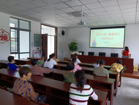 活動(dòng)伊始,志愿者結(jié)合教學(xué)視頻帶領(lǐng)老年人一起做了一套熱身養(yǎng)生操,幫助老年人進(jìn)行活動(dòng)熱身。提醒老年村民平時(shí)在家中也可自行鍛煉,舒展筋骨。隨后,志愿者通過PPT、視頻等方式給在場(chǎng)老年村民講解了為何老年人容易跌倒、如何避免老年人跌倒以及老年人跌倒后如何救援等內(nèi)容。志愿者叮囑老年村民平時(shí)出門時(shí)要慢行,注意腳下安全,天氣炎熱減少出門頻率。同時(shí),志愿者呼吁老年村民要改正不良的生活習(xí)慣,定期進(jìn)行體育鍛煉,選擇合身的寬松衣服,避免穿拖鞋或鞋底過于柔軟、容易滑倒的鞋子。