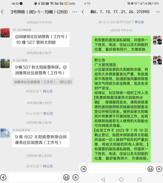 為消除安全隱患,潤康苑社區(qū)聯(lián)合街道物業(yè)公司共同采取了一系列措施來拆除廢棄熱水器。社區(qū)工作人員通過微信群定時推送信息,引導(dǎo)居民報名登記需要拆除的廢棄熱水器。經(jīng)過前期的排查,共登記到100余臺廢棄熱水器需要拆除,潤康苑社區(qū)將與街道物業(yè)公司合作,組織人員對潤康苑和融康苑兩個小區(qū)的廢棄熱水器進(jìn)行逐步拆除。