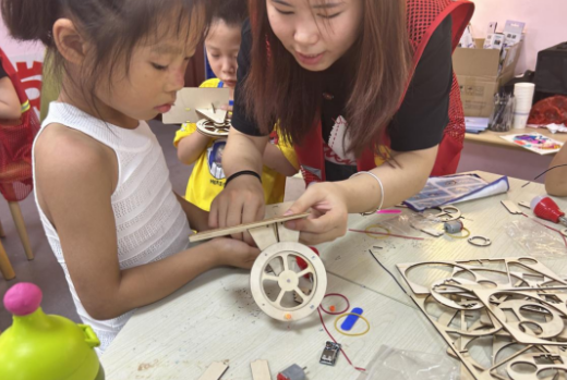 本次活動提前在轄區(qū)內(nèi)招募了10名返鄉(xiāng)大學(xué)生團(tuán)員志愿者,志愿者們?yōu)樾∨笥褌儙砹藙?chuàng)意潛水艇、手搖發(fā)電機(jī)、吃幣機(jī)器人、液壓挖掘機(jī)等創(chuàng)意小實驗;在實驗的過程中,志愿者老師們用通俗幽默的語言,給小朋友們講解各種物理趣味知識,并且?guī)е∨笥褌円黄饎邮种谱飨嚓P(guān)的小實驗,在整個動手制作的過程中,高深的物理知識一下子變得非常親切易懂。