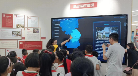 其次,在法院工作者小姐姐的帶領(lǐng)下,大家依次參觀了大廳、云展館、導(dǎo)訴臺(tái)和歷史陳列館等。通過對(duì)大量的圖片、文字、實(shí)物以及多媒體的介紹,工作人員生動(dòng)形象地展示了法院的歷史沿革、組織架構(gòu)、審判流程等方面的內(nèi)容。同學(xué)們都聆聽、觀察得十分仔細(xì),還時(shí)而提問交流,并在攝影區(qū)域紛紛拍照留念。