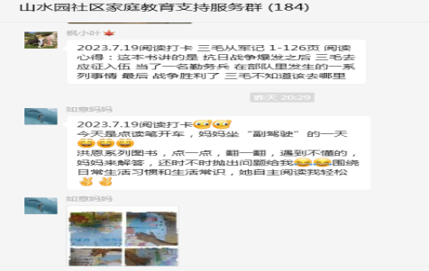 讀書打卡活動(dòng)于7月14日至8月12日開展,為期一個(gè)月,活動(dòng)一經(jīng)發(fā)布,群內(nèi)的家長和孩子紛紛積極參與此次線上活動(dòng),在微信群里打卡上傳與孩子閱讀的照片和視頻,分享孩子的閱讀打卡心得。