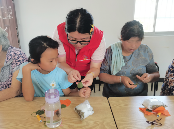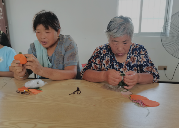 柿子香包掛件,事事如意的諧音,寓意著美好生活的祝愿。活動(dòng)現(xiàn)場(chǎng),志愿者給村民發(fā)放了柿子香包材料包,并且介紹了柿子香包的縫制方法步驟——對(duì)齊縫合、翻面整平、四角縫合、翻面穿繩、放入香囊、拉緊繩子......志愿者一步一步帶領(lǐng)村民學(xué)習(xí)縫制,大家從一開始的小心翼翼到熟能生巧,互相討論、互相幫助,邊縫制邊感觸道:“親手縫制個(gè)柿子包,希望家人事事如意。”在志愿者的耐心指導(dǎo)下,一個(gè)個(gè)精美雅致的柿子香包逐漸呈現(xiàn)在大家的眼前。