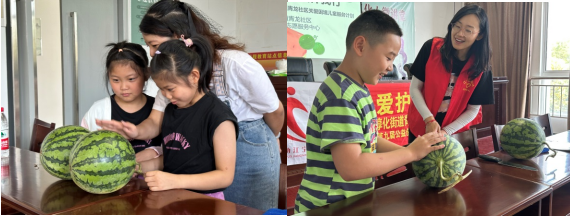 聽(tīng)一聽(tīng),辨一辨,小朋友們親身體驗(yàn)不同西瓜的顏色、瓜蔓,拍擊聲,在熱烈的投票過(guò)后現(xiàn)場(chǎng)切開(kāi)和大家揭秘,共享美味西瓜。