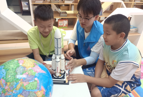 “火箭能有多大?火箭是怎樣飛上天的?”......課上,社區(qū)科普志愿者首先借助長征五號運載火箭模型,用通俗易懂的語言為小學員們科普了長征五號運載火箭的命名規(guī)則、箭體結構、升空使命和發(fā)射運行等知識,帶少兒們一同探索運載火箭奧秘的同時,還為少兒們普及了我國航天發(fā)展成就,講述了東方紅一號人造衛(wèi)星、神舟系列載人飛船、天宮號空間站等,科普了航天發(fā)射基地的選址條件及我國四大航天發(fā)射場,并帶少兒們通過地球儀進行了找尋。現(xiàn)場,科普志愿者與少兒們交流互動,學習氛圍濃厚。