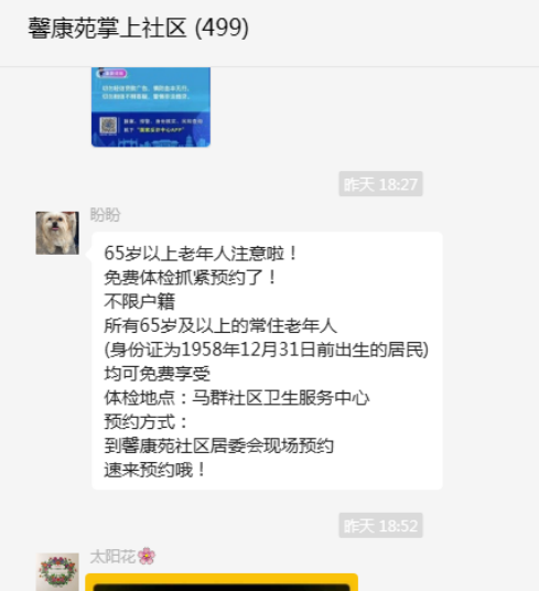 “我年年都會參加這個健康體檢,也是對自己負責”、“現(xiàn)在的助老政策真是越來越好”、“我家老人還沒參與,報個名,這個周六帶他過去”......群內,居民們紛紛回應道。