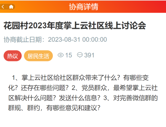 花園村充分利用掌上云社區(qū)平臺,做好黨建引領工作,拉近干群之間的距離,做好基層工作,更好為民服務?;▓@村希望通過此次討論會,了解黨員群眾所需所想,共建幸?;▓@。