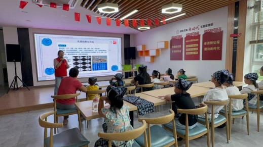 活動現(xiàn)場,志愿者們?yōu)楹⒆觽儙砹艘粓鼍实脑菊故尽V驹刚咧v述了扎染技藝的起源故事,讓孩子們沉浸在歷史的長河中。志愿者們耐心細致地解釋了扎染的特點,讓孩子們通過視聽與思考更深入地理解這門古老的藝術(shù)。