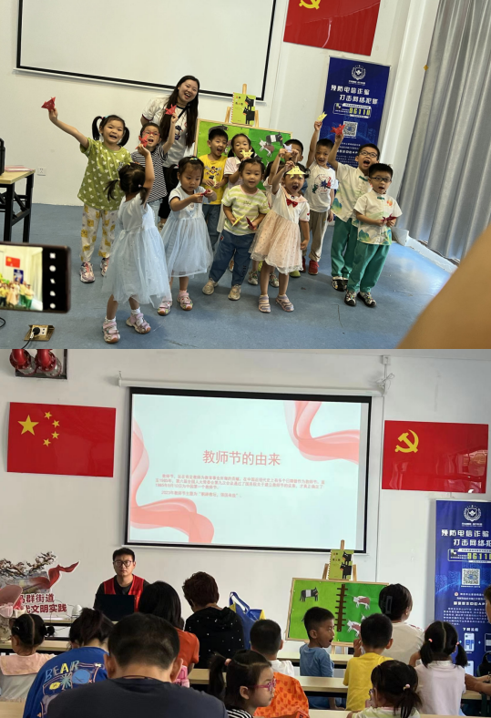教師節(jié)之際,社區(qū)工作人員順勢講解教師節(jié)的含義及由來,傳遞尊師敬師傳統(tǒng)文化。隨后,老師采用PPT的形式給大家展示《勇敢的克蘭西》故事,讓孩子們發(fā)揮自己的想象說出繪本里的故事和情節(jié),隨后一起思考一起講解,充分調(diào)動了大家學習閱讀觀察的積極性,也充分發(fā)揮這個年齡階段孩子的天性,引導(dǎo)青少年樹立正確的人生觀和價值觀。繪本故事講完,老師還和小朋友一起做了手工活動,給小朋友提供備好的剪刀、紙張、彩條等材料,細心講述制作的步驟,小朋友們在老師的指導(dǎo)下將彩條進行粘貼,利用模板形狀進行裁剪,很快“勇敢的克蘭西”就制作成功了。