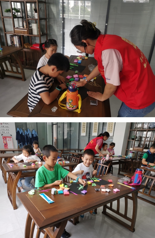 活動最后,志愿者帶領孩子們一起手工創(chuàng)作彩色的花園。社工先為孩子們發(fā)放粘土、硬紙卡、亞克力壓板等制作材料,一邊詳細講解彩色花園制作的具體步驟,一邊做著示范,讓孩子們掌握制作技巧和要領。孩子們認真聽完志愿者的講述后,選擇自己喜歡的粘土顏色,揉捏出一朵朵風格各異的花兒,他們還時不時相互分享鮮花的做法與顏色的調配,將對大自然的熱愛傾注到手中粘土里。