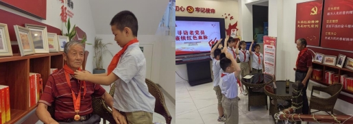 杜爺爺還意味深長地囑托道:“你們生活在幸福的新時代,一定要好好學習,天天進步,以后為國家做貢獻!”少先隊員們給杜爺爺戴上紅領巾,向杜爺爺敬禮。