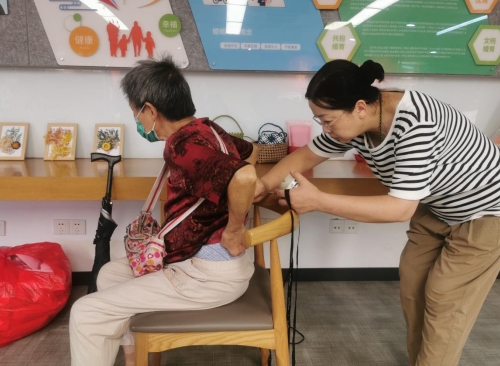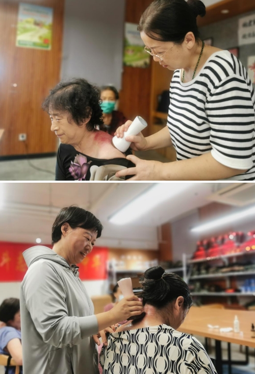 活動(dòng)中,吳慶星老師先帶領(lǐng)殘疾人學(xué)習(xí)康復(fù)理療的相關(guān)知識(shí),并耐心為他們講解頸、肩、腰等部位的保健常識(shí),教給他們一些簡(jiǎn)單易學(xué)的按摩方法。接著吳慶星和唐榮老師就開始為在場(chǎng)的每一位殘疾人一一進(jìn)行刮痧和艾灸的服務(wù)。從中,老師們通過(guò)了解殘疾人身體的不適癥狀,采取個(gè)性化治療手段,針對(duì)腰膝酸軟、頭暈耳鳴、四肢發(fā)冷等普遍陽(yáng)虛癥狀,為他們帶來(lái)了電子艾灸治療,將艾灸治療儀放在疼痛的部位,起到溫氣行血、活血化瘀的功效,能夠有效改善畏寒肢冷、乏力、疼痛等癥狀。對(duì)于長(zhǎng)期臥病在床或行走不便的個(gè)體,通過(guò)刮痧艾灸等刺激經(jīng)穴,為他們活絡(luò)筋骨,使他們氣血通暢,有效緩解頸、腰、背部的肌肉勞損等疼痛。整個(gè)過(guò)程下來(lái),老師們已經(jīng)累的滿頭大汗,手也酸痛不已,如此還不忘安慰大家:“沒(méi)事哦,我們不累,能為大家服務(wù),我們感到很幸福。”