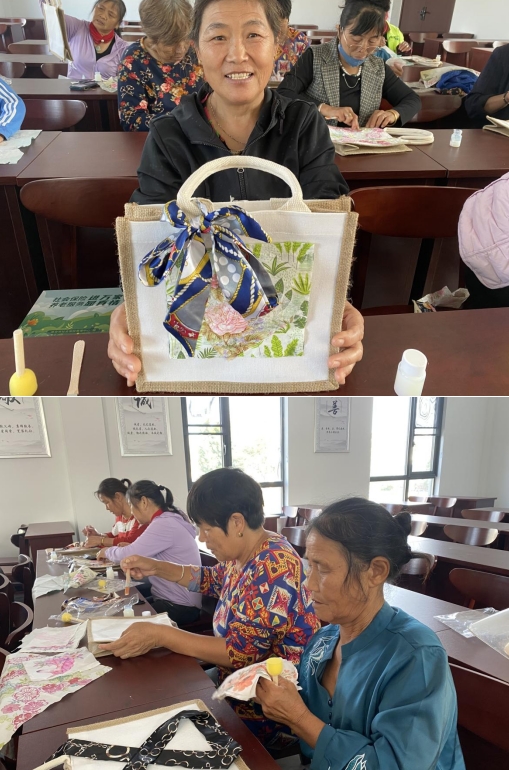 而后,志愿者們通過PPT和視頻的形式,向大家展示了手工制作蝶骨巴包的方法和注意事項(xiàng)。每人都收到了一個(gè)帆布包制作材料包,志愿者們引導(dǎo)大家自行發(fā)揮想象力,激發(fā)創(chuàng)意,開始進(jìn)行制作。一雙雙靈巧的雙手在活動(dòng)室里翻飛,一張張笑臉在每個(gè)人的臉龐綻放,充滿了童真與喜悅。志愿者們不辭辛勞地幫助每一位需要幫助的村民,耐心地解答他們遇到的問題。大家相互之間分享了制作過程中的心得和體會(huì),互相鼓勵(lì)和贊美。