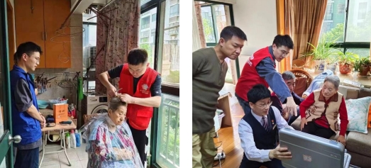 該戶家庭里有位百歲老人是前不久剛從老家接到這里來生活的,網(wǎng)格員同志對這戶家庭也是尤為關注經(jīng)常聯(lián)系看是否有需要社區(qū)幫助的地方。當?shù)弥先诵枰戆l(fā)的時候立馬聯(lián)系了轄區(qū)內(nèi)一家理發(fā)店老板馬師傅,馬師傅聽到上門為百歲老人理發(fā)也是義不容辭的答應了。
