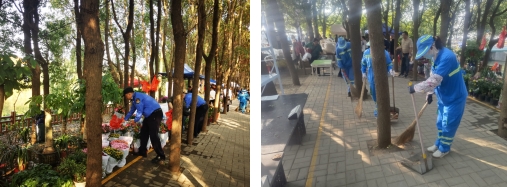 菊花展期間,城管隊員針對菊花展周邊非機動車亂停亂放、機動車違停等行為進行及時清理疏導,規(guī)范樂農(nóng)集市內(nèi)商戶經(jīng)營秩序;環(huán)衛(wèi)工人對菊花展周邊道路兩側(cè)綠化帶、草坪,樂農(nóng)集市內(nèi)攤位等區(qū)域衛(wèi)生死角進行全面清理。
