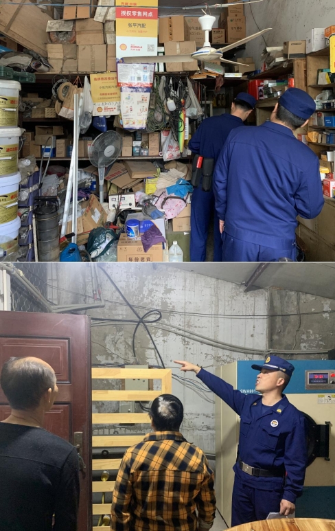 社區(qū)工作人員與特勤隊(duì)員對(duì)于“九小場(chǎng)所”安全出口是否暢通、消防設(shè)施是否正常運(yùn)行、是否存在電線私拉亂接等現(xiàn)象進(jìn)行檢查。