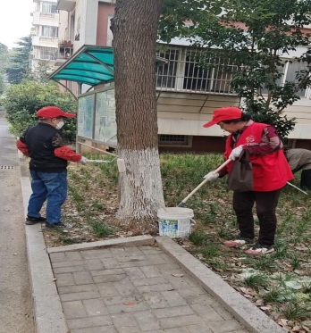 活動中,社區(qū)志愿者們按要求給每棵樹標(biāo)定1.2米的基準(zhǔn)線,頂端纏繞紅色膠帶,然后利用生石灰、防蟲藥劑等混合配比液進(jìn)行刷白。刷白后不僅能夠防蟲防凍,還起到美化效果。在保護(hù)好樹木的同時(shí),志愿者還將林帶內(nèi)的垃圾、雜物、雜草進(jìn)行清理。大家通過分工合作,耐心仔細(xì)地為大樹披上了一件又一件健康、溫暖的白色“冬衣”,為社區(qū)增添了一道亮麗的風(fēng)景線。