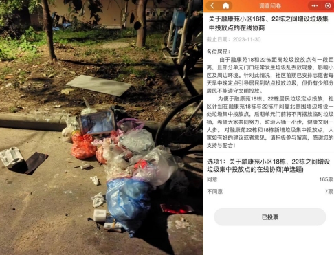 為了解決這一問題,社區(qū)安排了掌上云“益家人”志愿每天早、中、晚三個(gè)時(shí)間段到站點(diǎn)引導(dǎo)居民投放垃圾,取得了一定的成效。但仍然有一小部分居民無法遵守文明投放的要求。為此,社區(qū)書記和網(wǎng)格員及時(shí)深入18棟和22棟的居民家中,收集他們的意見,并共同商討解決方案。經(jīng)過集思廣益,社區(qū)最終決定在融康苑18棟和22棟之間的北側(cè)圍墻邊增設(shè)一處垃圾集中投放點(diǎn),以方便這兩棟樓的居民進(jìn)行垃圾定點(diǎn)投放,后期單元門前將不再設(shè)置臨時(shí)垃圾桶。
