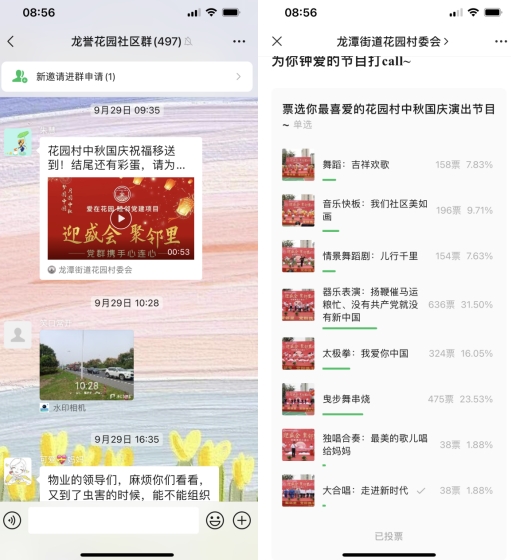 國慶期間,龍?zhí)督值阑▓@村黨委舉辦了“夢圓中秋 月圓中秋——迎盛會 聚鄰里 黨群攜手心連心”中秋國慶文藝匯演,社區(qū)居民積極報名參與文藝匯演,載歌載舞共唱節(jié)慶贊歌,獲得了居民的好評。匯演結(jié)束,花園村依托“掌上云社區(qū)”開展線上評選活動,邀請居民線上為喜歡的節(jié)目投票。
