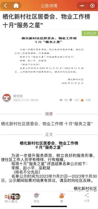 11月27日,棲化新村社區(qū)在“掌上云社區(qū)”內(nèi)開展“服務之星”評比活動。該活動旨在樹立正向榜樣,激勵社區(qū)工作人員為居民提供更優(yōu)質(zhì)的服務。