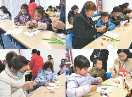 繪本故事結(jié)束后,社區(qū)志愿者繼續(xù)帶領(lǐng)小朋友們開始了手工——花格子手套的制作。小朋友們在白色的卡紙上,粘上一塊一塊彩色的不織布方塊,又貼上棉花當(dāng)作毛茸茸的邊。這樣一副色彩活潑,看上去又暖和的手套手工就完成了!在這樣一個(gè)寒冷的冬天里,一副手套就讓孩子們感受到溫暖和幸福。