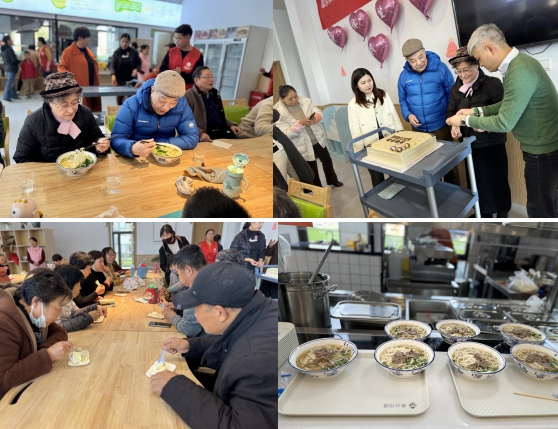 最后,志愿者們?yōu)槔先藗兌藖砹嗣牢兜纳盏案?,大家一起唱生日歌,分享蛋糕、吃長壽面,一邊品嘗美食,一邊享受這難忘的時(shí)刻。