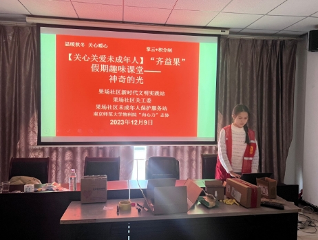為促進科技創(chuàng)新,普及科學(xué)知識,弘揚科學(xué)精神,助力未成年人科學(xué)素質(zhì)的提升,南師大物科院“向心力”志協(xié)在領(lǐng)隊張潔同學(xué)的帶領(lǐng)下來到馬群街道果場社區(qū),與社區(qū)未成年人保護服務(wù)站、關(guān)工委共同依托社區(qū)新時代文明實踐站科技與科普服務(wù)平臺,借助“齊益果”掌云+積分制工作機制組織社區(qū)未成人及其家庭進行“溫暖秋冬 關(guān)心暖心”主題物理科普課堂活動。