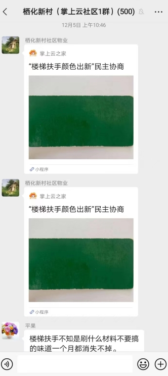 在民主協(xié)商過程中,居民們積極參與,紛紛在“掌上云社區(qū)”中留言表達自己的看法。大家一致認為,新的扶手顏色應(yīng)該既能提升樓道的美觀度,又能保持實用性;同時,為了方便居民們?nèi)粘3鲂?,扶手顏色?yīng)該與周圍環(huán)境相協(xié)調(diào),避免對居民造成視覺上的干擾。