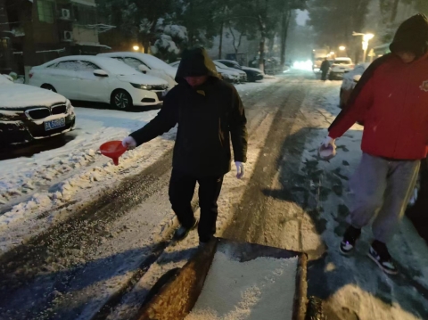 傍晚時分,由社區(qū)工作人員、物業(yè)人員、黨員骨干和平安志愿者組成的掃雪隊伍集結(jié)到位,全副武裝,迅速投入清雪作業(yè)中?,F(xiàn)場,大家分工協(xié)作,以“動”制“凍”,有的清鏟積雪,有的清掃路面,有的灑融雪劑,有的鋪設(shè)草墊......一派熱火朝天的景象。看到“掌上云”社區(qū)群內(nèi)的掃雪動態(tài),不少居民紛紛下樓,參與到掃雪防凍行動中,有精神抖擻的青年,有不讓須眉的巾幗,有白發(fā)蒼蒼的老人,也有互動有愛的親子,從夜色朦朧到花燈初上,一個個忙碌的身影成為小區(qū)內(nèi)一道靚麗的風(fēng)景線。