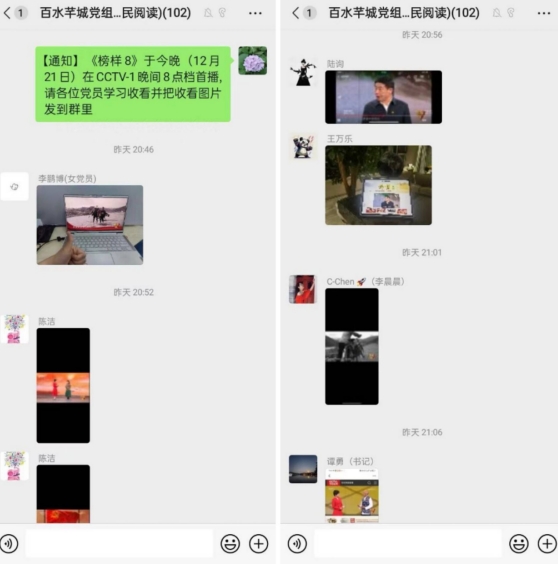 當晚,百水芊城社區(qū)黨委通過“掌上云”微信群里,號召平日里上班年輕黨員及腿腳行動不便老黨員及時參與線上學(xué)習(xí),收看《榜樣8》專題節(jié)目,并在群里簽到發(fā)圖片和視頻,掀起學(xué)習(xí)新熱潮,引導(dǎo)廣大黨員見賢思齊,追尋榜樣足跡、汲取榜樣力量。