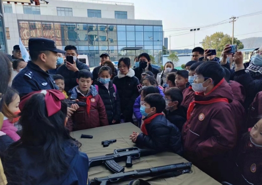 在槍支模型展示區(qū),大家觀摩了槍械模型等警用裝備。一支支槍擺在桌上,讓人瞬間移不開眼。警務(wù)教官們先一一向大家耐心解說每支槍的特點,同學(xué)們紛紛按捺住躍躍欲試的心情,認真聆聽教官的講解。“這些槍好酷啊!”大家通過摸一摸、戴一戴等體驗和互動,了解警用裝備的用途、使用場合以及如何防范“壞人”。純真的眼神里滿滿透露著對警察職業(yè)的無限崇拜之情。