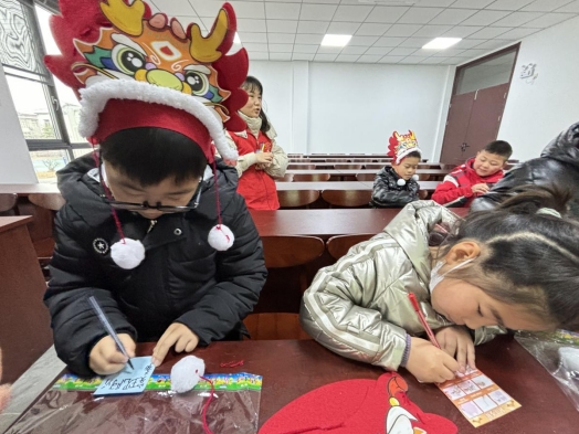 除了閱讀和討論,活動還為孩子們準備了手工制作環(huán)節(jié)。志愿者們發(fā)放了“頭龍帽”制作材料包,引導孩子們親自動手制作頭龍帽。在志愿者的耐心指導下,孩子們發(fā)揮想象力,認真制作著屬于自己的頭龍帽。不一會兒,一個個精美的頭龍帽就完成了。孩子們戴上自己制作的頭龍帽,臉上洋溢著自豪和喜悅。此外,活動還特別設置了寫下新年期待的環(huán)節(jié)。志愿者們邀請孩子們用紙筆寫下自己的新年愿望和期待。活動最后,柏墅村為孩子們準備了龍年主題公仔盲盒抽取,讓孩子們感受著迎接新年的喜悅和美好。