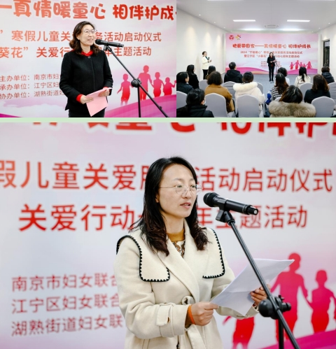 啟動儀式伊始,區(qū)婦聯(lián)夏主席上臺致辭,她代表江寧區(qū)婦聯(lián),對參與此次活動的領(lǐng)導(dǎo)、來賓和孩子們表示熱烈歡迎和美好祝愿。夏主席表示,江寧區(qū)各級婦聯(lián)組織一直高度重視兒童關(guān)愛工作,尤其是困境(留守)兒童的關(guān)愛。夏主席希望全區(qū)各級婦聯(lián)積極發(fā)動社會力量參與,提供心理疏導(dǎo)、家庭教育指導(dǎo)等關(guān)愛服務(wù),切實將關(guān)愛送到每個家庭和兒童身邊。隨后,現(xiàn)場發(fā)布了南京市各區(qū)婦聯(lián)寒假兒童關(guān)愛服務(wù)內(nèi)容,讓在場的家長和孩子們更加了解各項服務(wù)和活動安排。