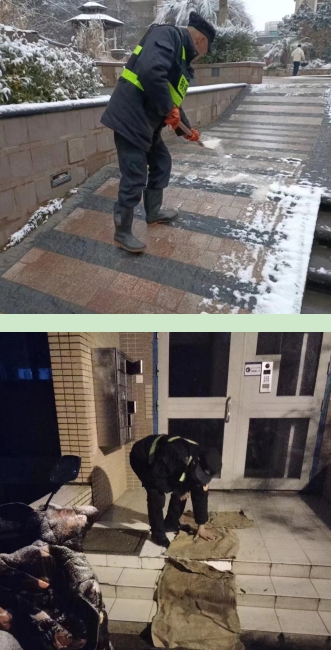 金堯花園轄區(qū)上城風景5-11棟掌上云居民交流群里居民在交流,發(fā)現時家門時單元門口的臺階很是濕滑,提醒其他業(yè)主注意安全。就在這同時,掌上云交流群里管理員也觀注到了這一信息。于是,立刻回復群居民,社區(qū)和物業(yè)已經在行動。隨即將工作人員正在陸續(xù)鋪設樓道口與積雪干道的照片轉發(fā)到群里,提醒居民還是要注意安全。就是這樣,在物業(yè)的辛苦付出下,在居民的渴望下,南苑小區(qū)19棟55個單元,工作人員頂著嚴寒在寒風夜色中樓道單元門口的草墊鋪設完畢。