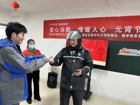近年來(lái),新業(yè)態(tài)經(jīng)濟(jì)蓬勃發(fā)展,新就業(yè)群體人數(shù)激增。值此黨員冬訓(xùn)與元宵節(jié)來(lái)臨之際,南京市棲霞區(qū)馬群街道蛇盤(pán)社區(qū)黨總支召集黨員志愿者為轄區(qū)快遞員、外賣(mài)騎手等新業(yè)態(tài)新就業(yè)群體送上冬日的溫暖及新春的祝福。