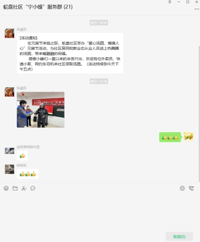 “小哥們辛苦了,來(lái)喝碗現(xiàn)煮的湯圓吧!”隨著寧小蜂驛站志愿者一聲聲親切的問(wèn)候,路過(guò)的快遞員、外賣(mài)員小哥紛紛駐足觀望:“非常感謝,以后微信群里常聯(lián)系!”與此同時(shí),另一部分黨員志愿者也將象征著闔家團(tuán)圓的元宵送到轄區(qū)各個(gè)快遞站點(diǎn)工作人員的手中,向他們傳達(dá)最誠(chéng)摯的節(jié)日祝福和問(wèn)候,讓他們切實(shí)感受到蛇盤(pán)社區(qū)大家庭的溫暖。