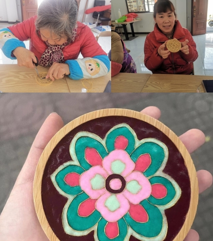在掐絲琺瑯手工制作中,志愿者老師為大家講解了掐絲琺瑯的歷史淵源、發(fā)展歷程和掐絲等工藝流程。婦女阿姨們躍躍欲試,在老師的指導(dǎo)下,每個(gè)人都小心地拿起金絲線,按照底板的輪廓勾勒出一個(gè)一個(gè)線條,掐絲、注膠、調(diào)沙、上色,在一個(gè)半小時(shí)的制作過(guò)程中,大家相互交流,互幫互助,興致盎然,盡情享受著親手創(chuàng)作的樂趣。