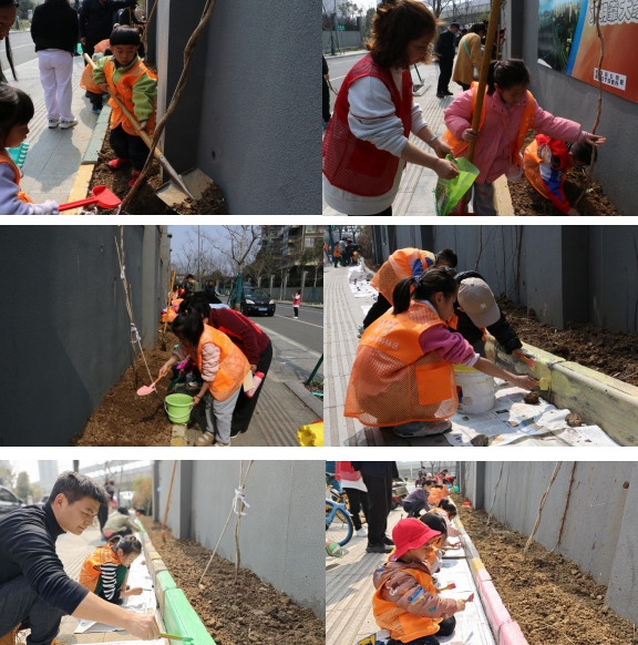 活動現(xiàn)場,小朋友們攜手家長們,挽起袖子,全情投入,揮舞鐵鍬挖土、細(xì)心扶正樹苗、耐心培土踩實、合力澆水灌溉,一片熱火朝天的勞動景象中交織著歡聲笑語。緊接著,大家又化身為“小小粉刷匠”,3組小朋友用不同顏色的戶外顏料,將原本破舊不堪的石頭護欄刷得煥然一新。在三彩護欄的圍擋內(nèi),大家栽下的一株株樹苗迎風(fēng)挺立、生機盎然。仿佛在向人們展示著它們頑強的生命力,不僅承載著小朋友們和小苗共成長的愿景,也成了龍西社區(qū)綠色生態(tài)建設(shè)的一道亮麗風(fēng)景線。