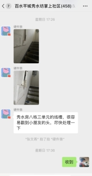 近日,百水芊城社區(qū)秀水坊八幢三單元的居民發(fā)現(xiàn)樓道內(nèi)的線路管道翹起來了,上下樓時(shí)候很容易戳到小朋友的頭,存在安全隱患,于是通過“掌上云”微信向社區(qū)反映此情況,希望得到關(guān)注和妥善解決。