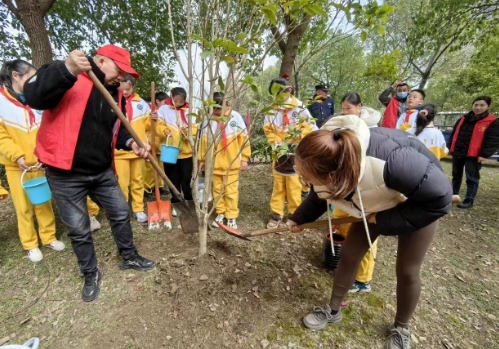 在老黨員的帶領(lǐng)下,孩子們領(lǐng)取了樹苗、鋤頭、鏟子、桶子等工具開始種樹。黨員和孩子們?nèi)艘唤M,五人一群,揮鍬培土、提水澆灌,齊心協(xié)力把一棵棵象征著廉潔的小樹苗栽在綠地上。