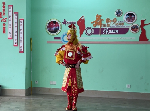 金全福老師身著華麗戲服,手執(zhí)金箍棒,生動(dòng)再現(xiàn)了美猴王孫悟空的智勇形象。他的精彩演出不僅讓老人們欣賞到了中華傳統(tǒng)戲曲的魅力,更在他們心中種下了樂(lè)觀向上的精神力量。他借助國(guó)學(xué)藝術(shù)的力量,將歡笑和溫暖送進(jìn)每一位老人的心田,讓他們?cè)谄椒驳娜兆永锔惺艿缴畹亩嗖逝c希望。