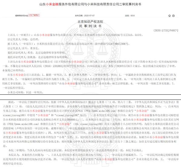 根據(jù)2018年12月的一審判決,山東小米金融須立即停止在其網(wǎng)站(www.midai100.com)和微信公眾號(hào)“小米金融”(ID:xiaomijinrong100)中使用“小米金融”和“xiaomijinrong100”標(biāo)識(shí),向小米公司賠償經(jīng)濟(jì)損失、維權(quán)合理開(kāi)支共計(jì)30萬(wàn)元,并停止使用現(xiàn)企業(yè)名稱,向工商行政管理機(jī)關(guān)申請(qǐng)變更企業(yè)名稱,變更后的企業(yè)名稱不得包含“小米”字樣。