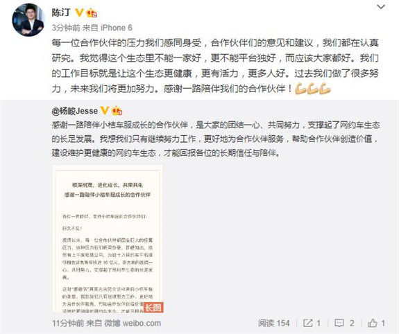小桔車服總經(jīng)理陳汀通過微博轉(zhuǎn)發(fā)了這一內(nèi)容,表示合作伙伴們的意見和建議都在認真研究。這個生態(tài)里不能一家好,更不能平臺獨好,而應(yīng)該大家都好,希望這個生態(tài)更健康,更有活力,未來也將更加努力。